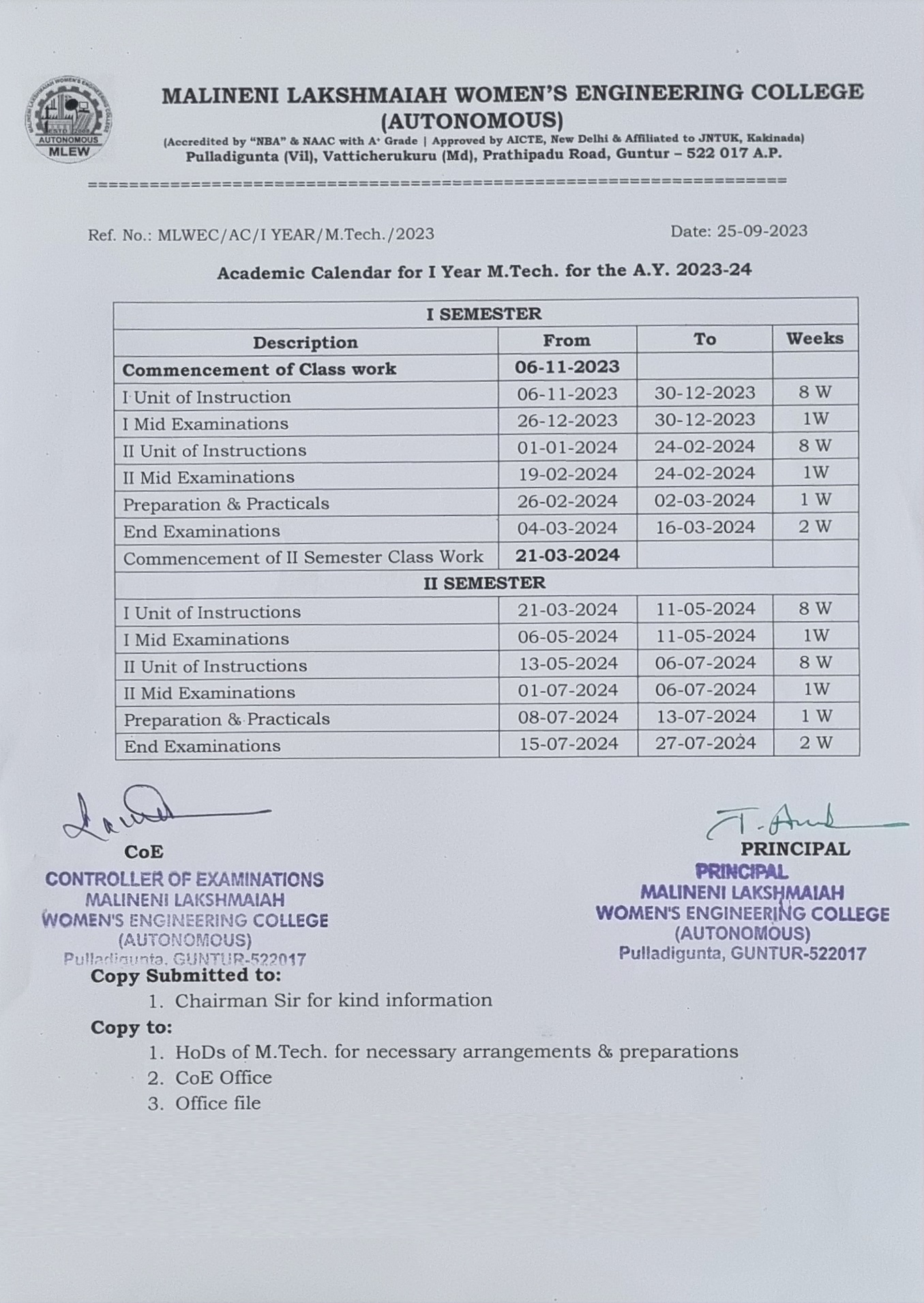I M.Tech Academic Calendar for the Academic Year 2023-24